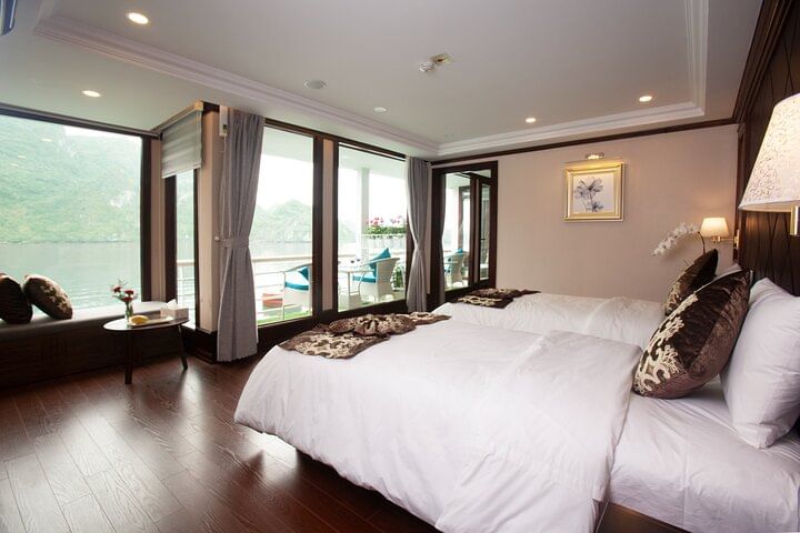 This tour offer one of the finest mid-size cruise ships on the sea route of Halong Bay to Lan Ha Bay. She is a brand-new cruise of 16 & 18 spacious cabins, built in full windows, ample deck and well-equipped interior and she possibly owns the top customer services. Our aims at an ultimate leisure, perfect for couples and families to explore Lan Ha Bay, and to discover untouched areas within the World Heritage Halong Bay ensemble.